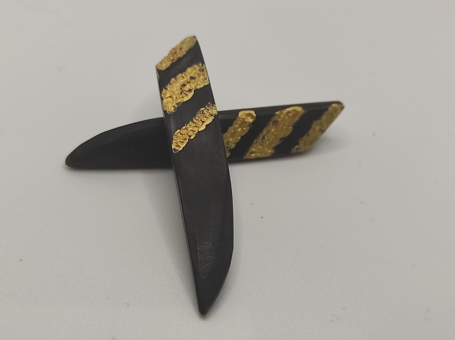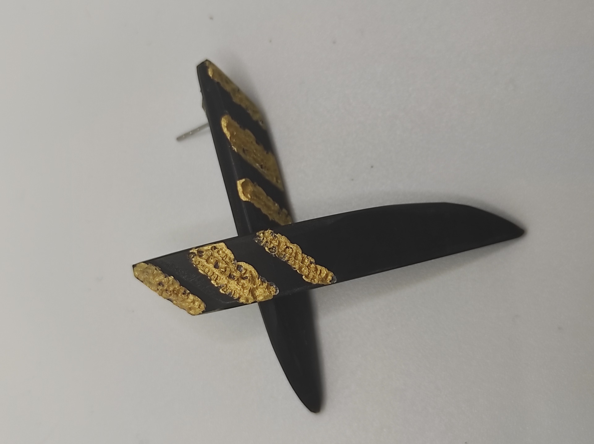 Cercei sculptați în corn de bivol. Model lung, vopsit cu culoare acrilică, aurie.