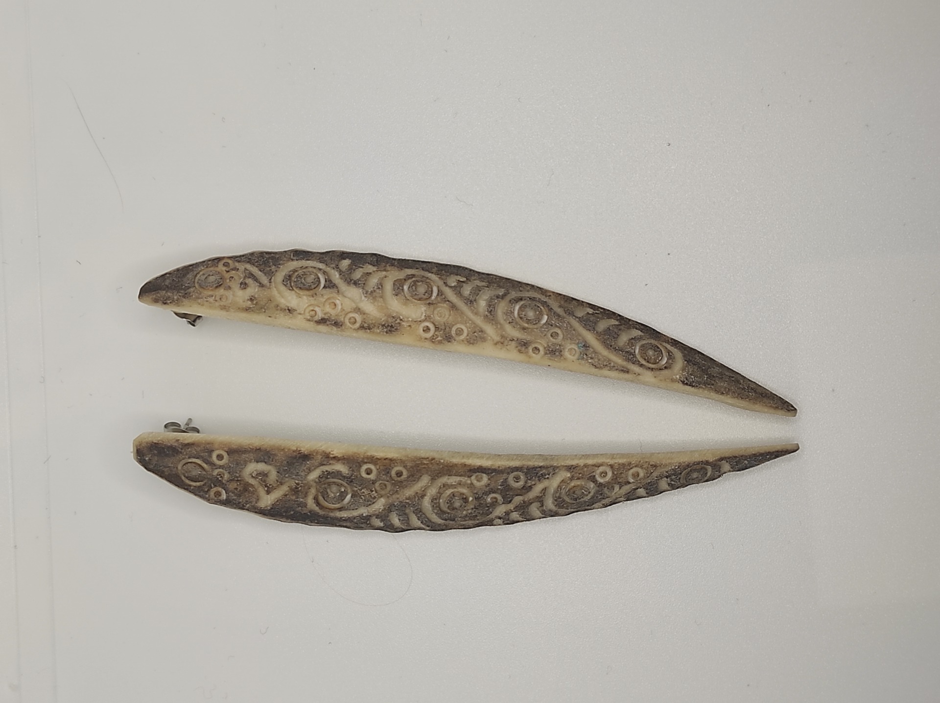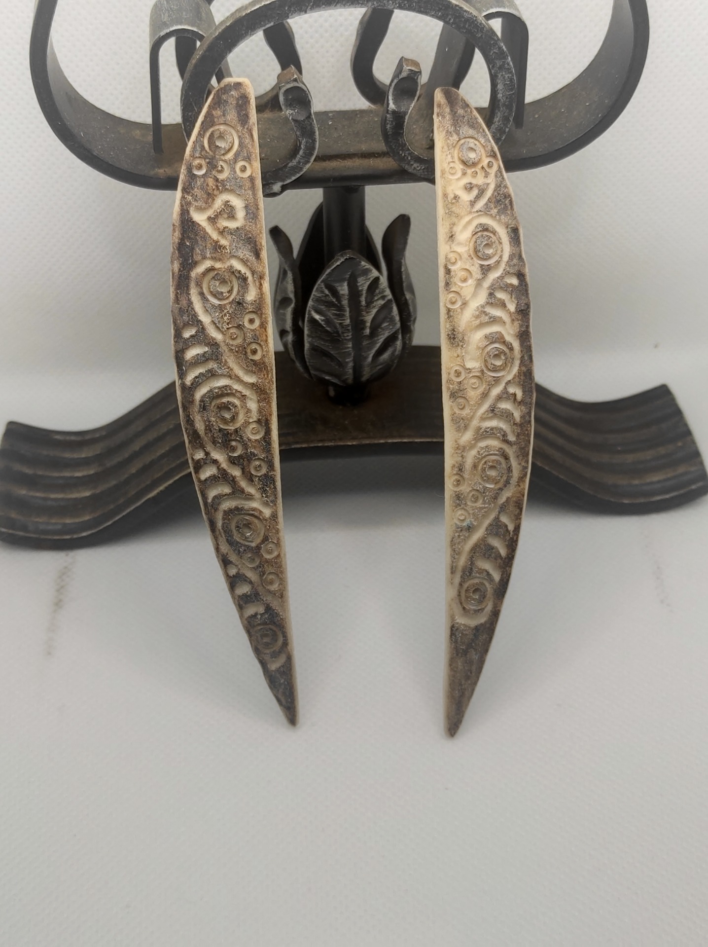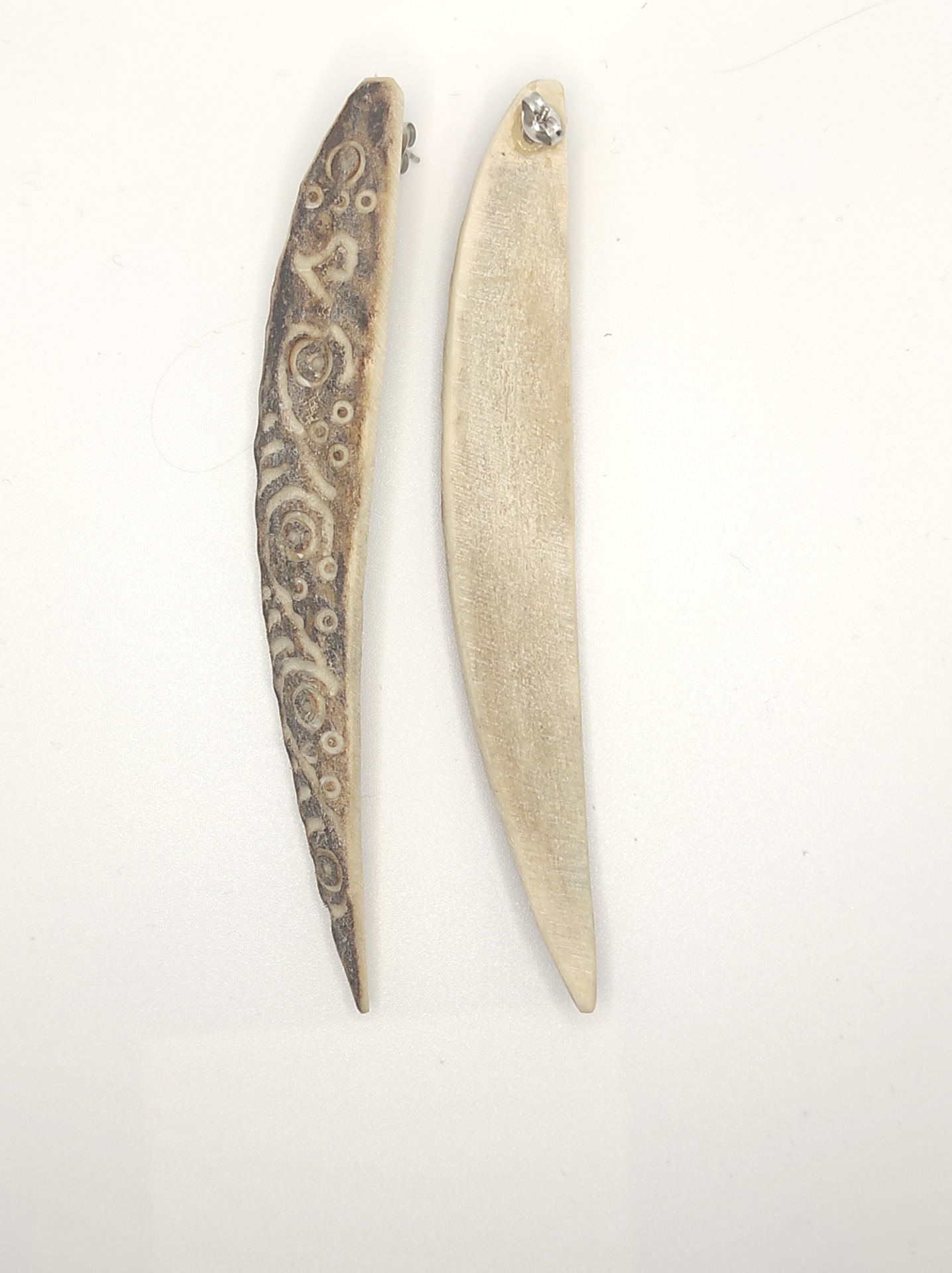 Cercei sculptați în corn de cerb.